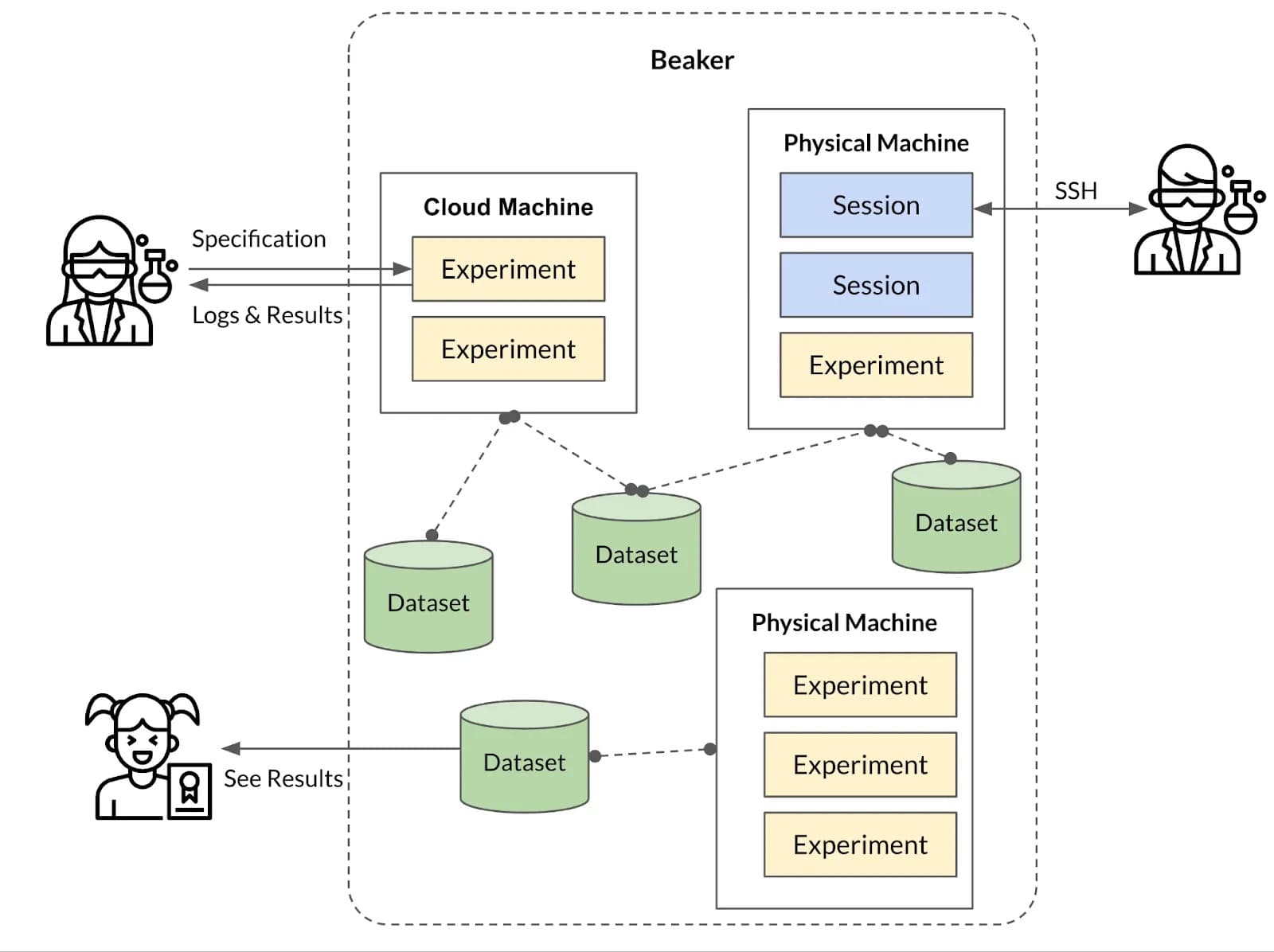 With these ideas in mind, we’ve created Beaker to execute batch experiments, to automatically provision machines in the cloud to meet demand surges, and to provide requested resources for interactive shell sessions.